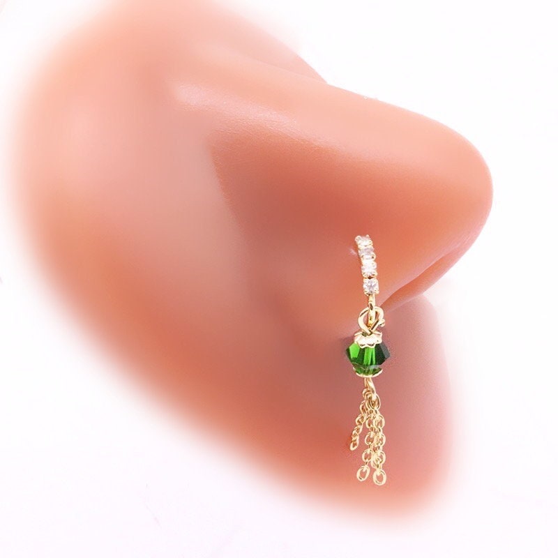 Unique gold plated tassel nose ring. Choice of colored bead. The ring section has four cute sparkling rhinestone crystals. Truly unique nose rings.
