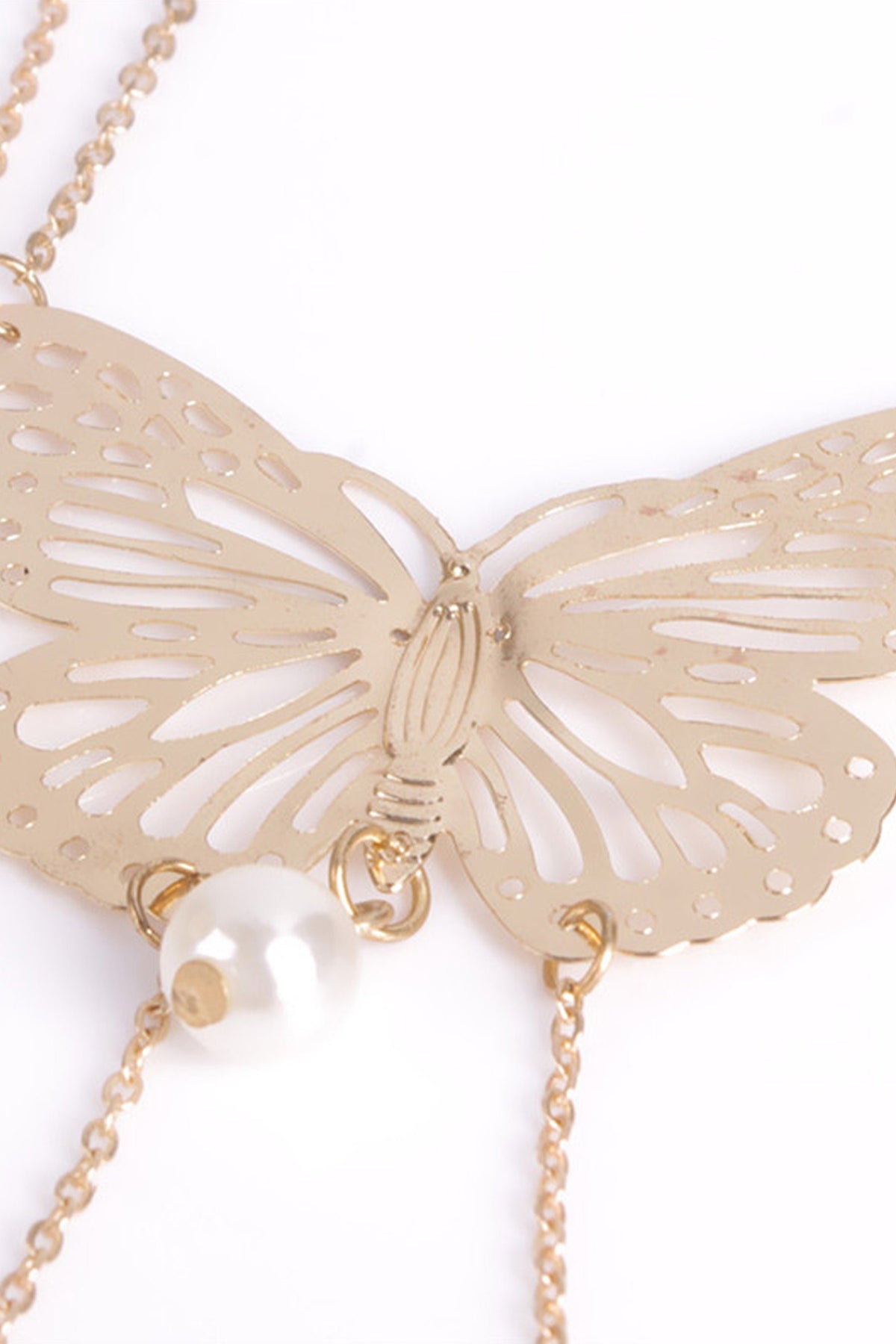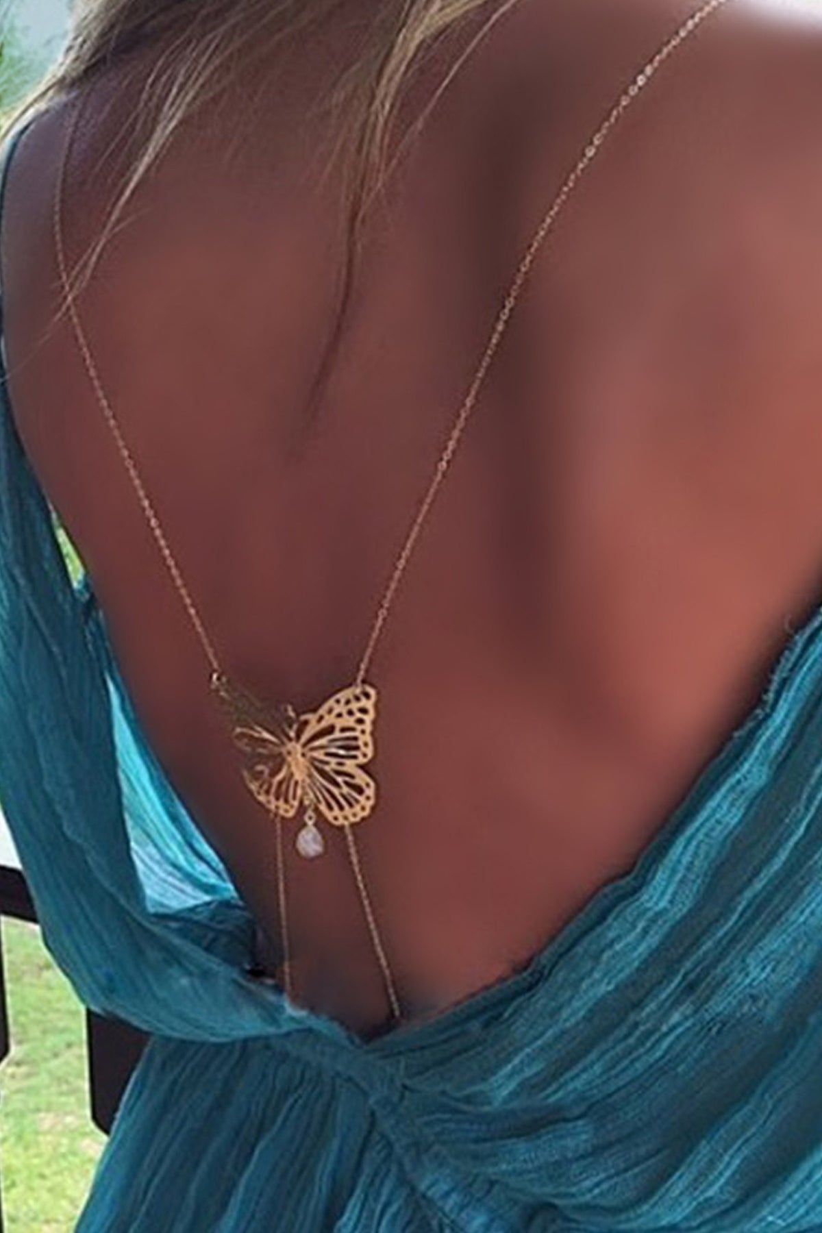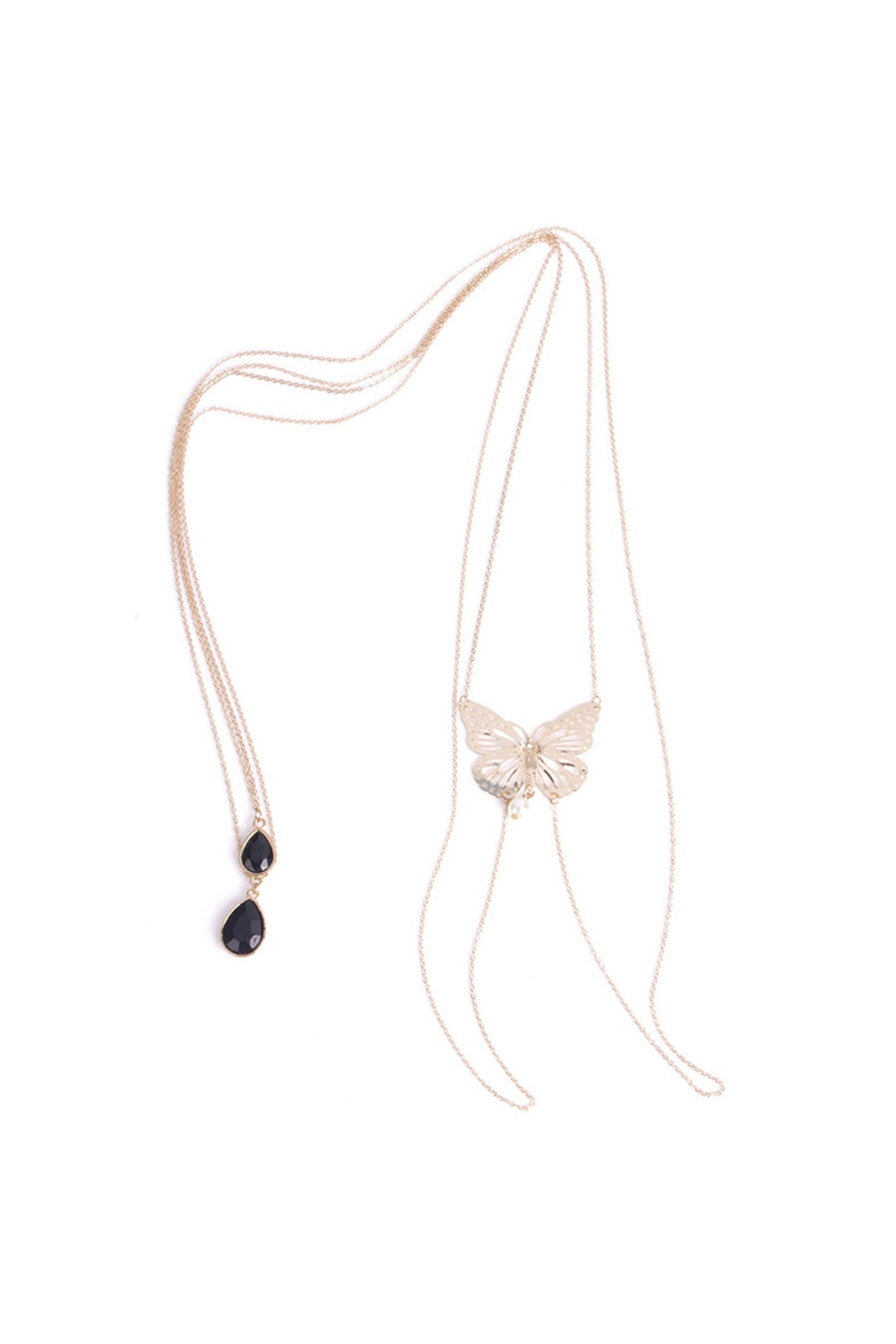 Embrace your inner Y2K energy this summer with this shimmering body chain! Featuring a gold body chain, a golden metal butterfly pendant, and a black gemstone detailing. Team with low rise jeans and a crop top for the ultimate throwback 2000's styled outfit!