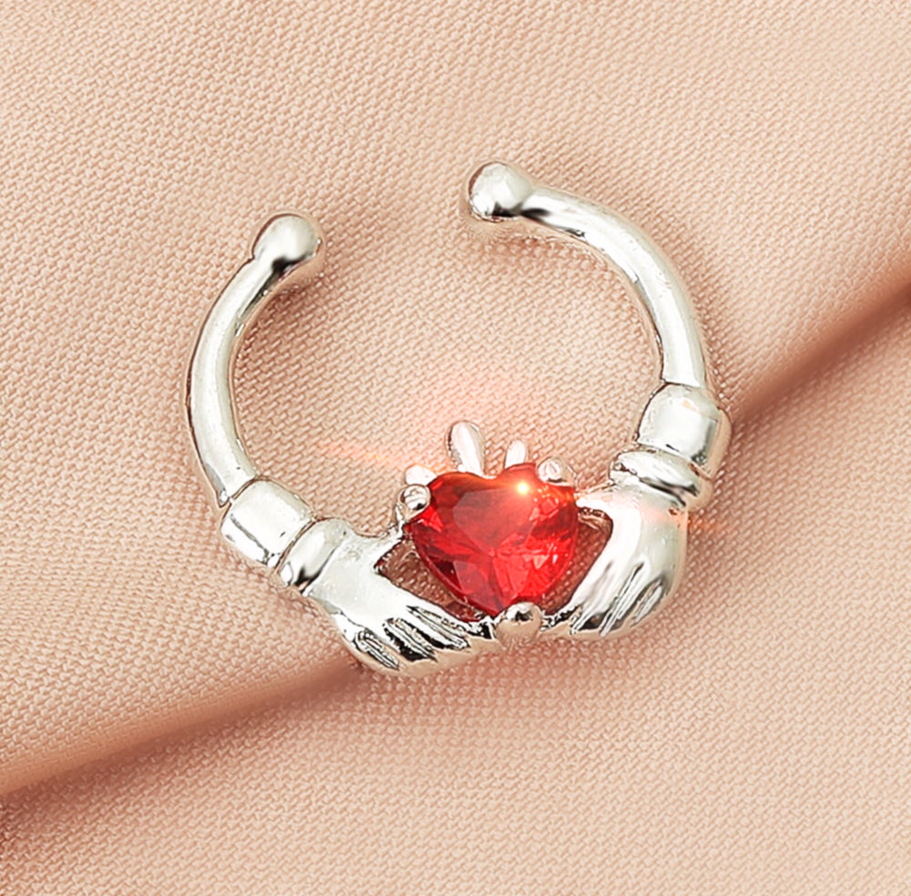 Silver Hand Horseshoe Septum Ring with Red Crystal Heart, Faux Fake Nose Septum Piercing