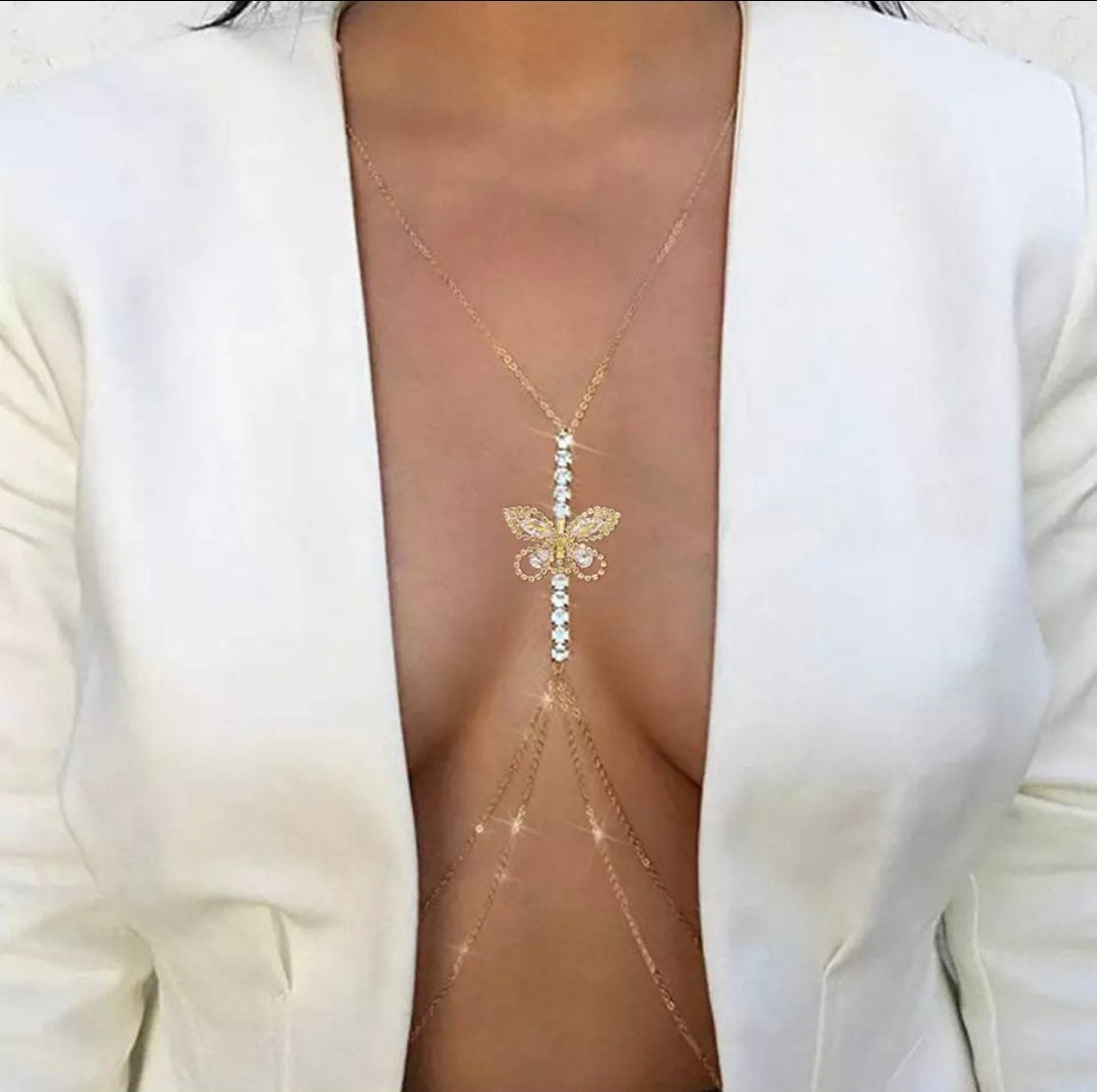 Y2K Butterfly Crystal Rhinestone Bra Body Chain Harness, Rave Jewellery Festival Bikini Necklace Body Chain, Available in Silver & Gold (48 Hour Dispatch)
