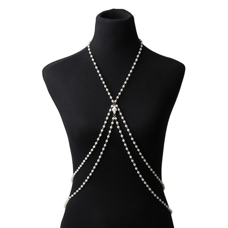 Pearl Body Chain, Multi-Layer Gold Finish Body Jewellery Chain for Women, Faux Pearl Tassel Chain Necklaces & Pendants (48 Hour Dispatch)