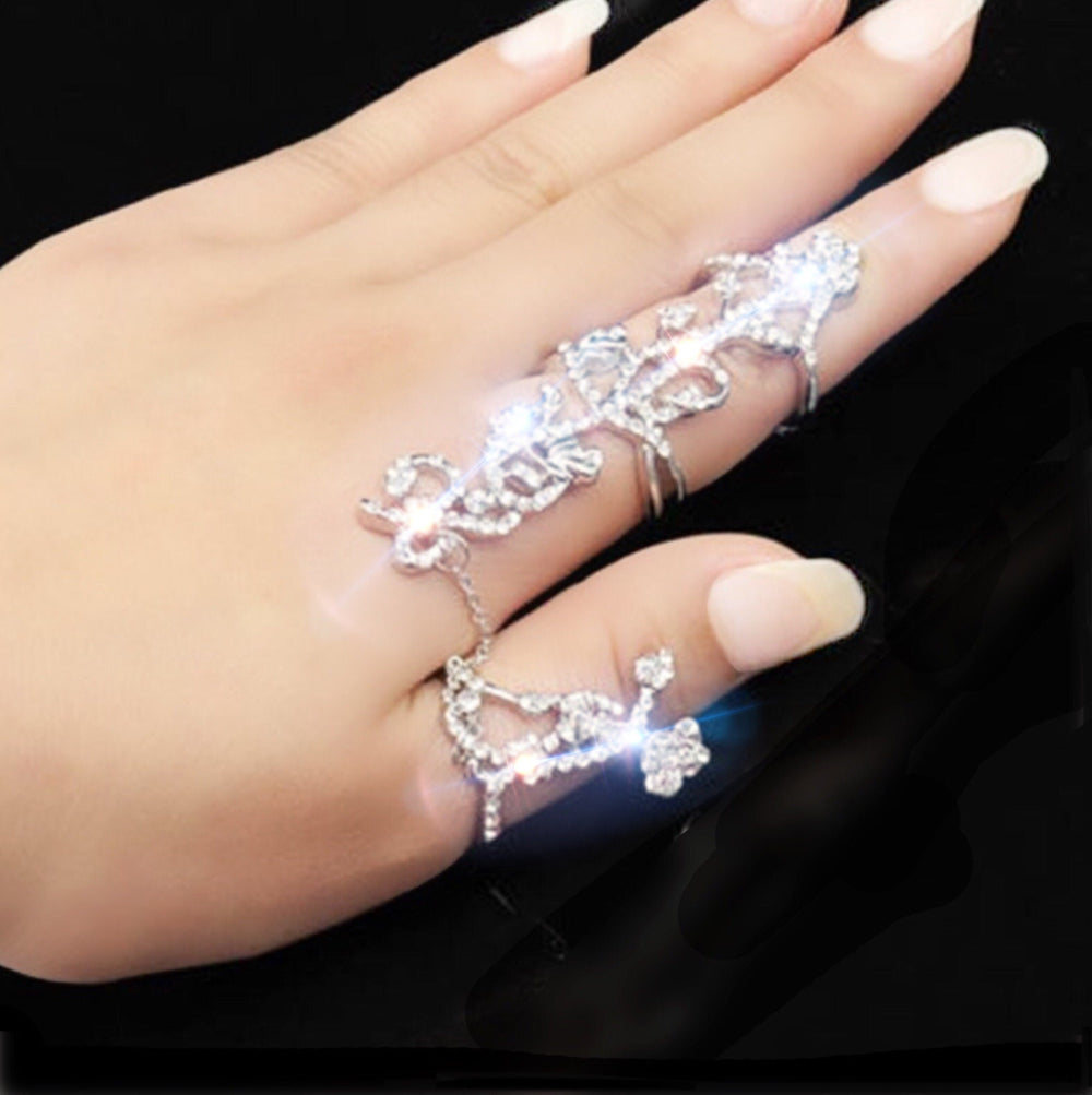 Crystal Two Finger Ring Link Chain, Adjustable Rings, Wedding Jewelry, Bridal Jewellery, Silver, Gift Idea (48 Hour Dispatch)