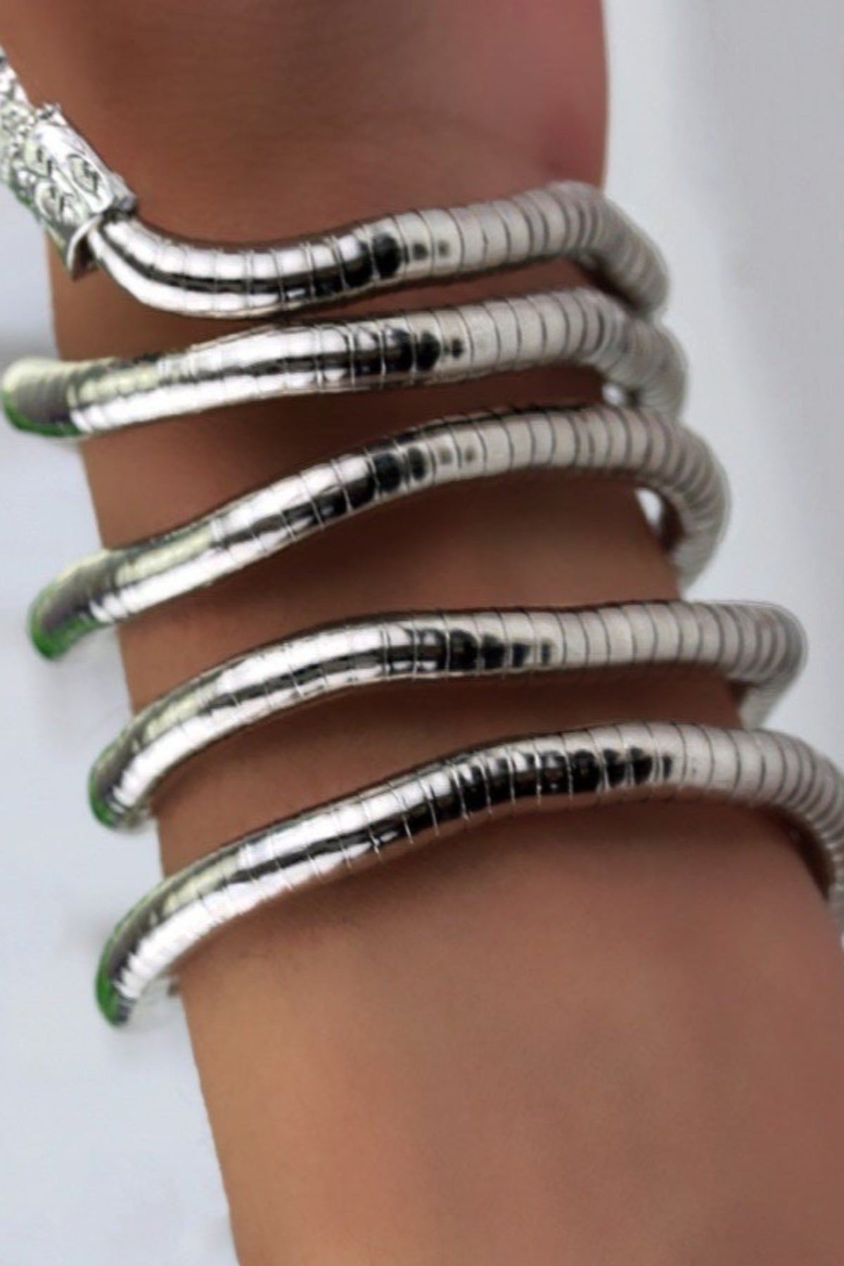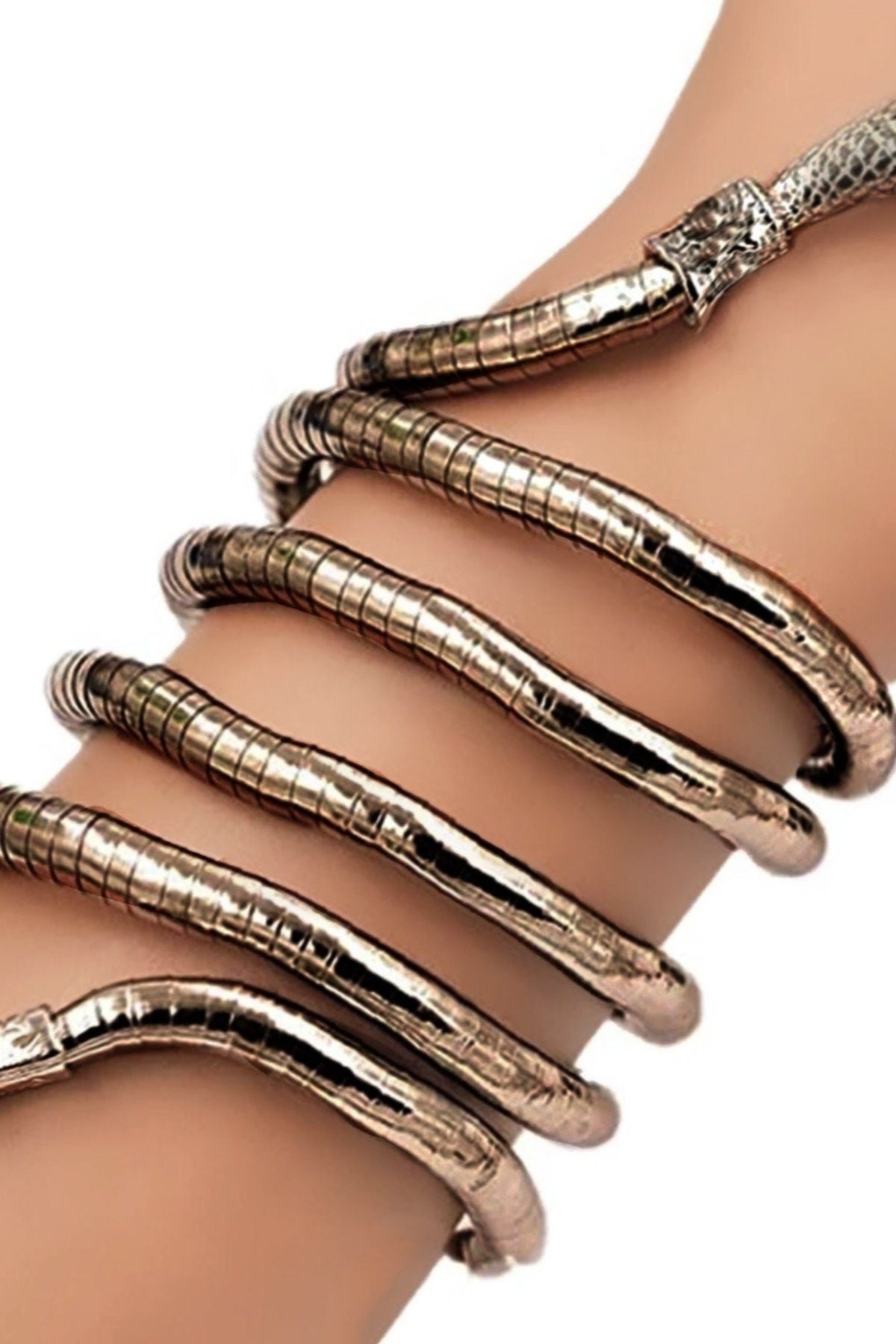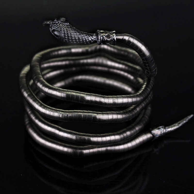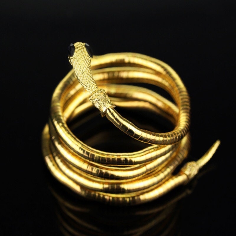 Adjustable gold or black finish snake bracelet with black rhinestone crystal eyes. Can also be worn as an anklet or necklace due to the adjustable nature of the item.